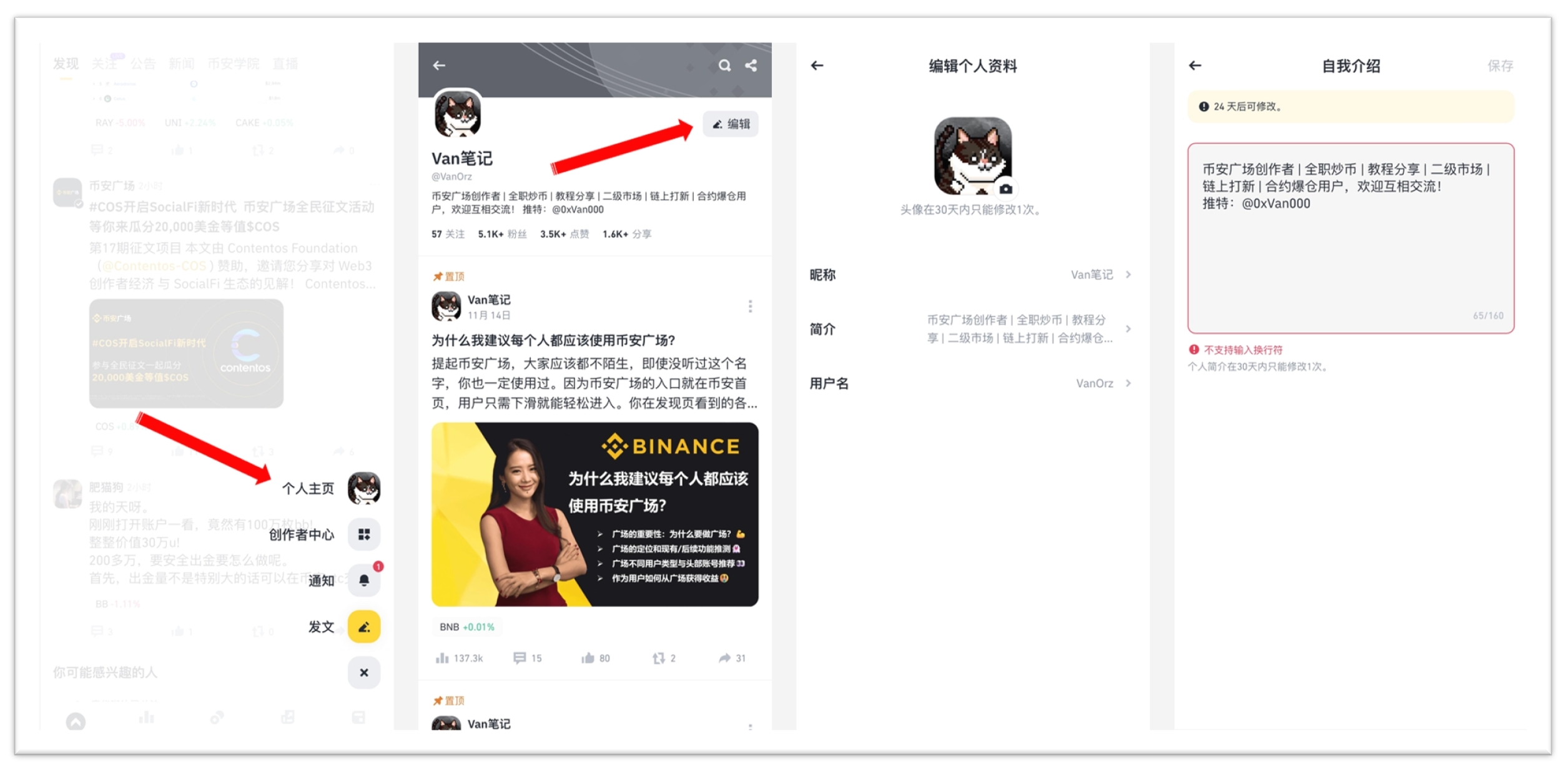 Для входа на площадку Binance не нужно создавать отдельный аккаунт, просто войдите в свой аккаунт Binance, прокрутите страницу вниз на главной странице, перейдите в раздел площадки, нажмите желтую кнопку в правом нижнем углу, чтобы перейти на личную страницу, затем нажмите на правый верхний угол для редактирования, чтобы настроить аватар, никнейм, описание и имя пользователя. Кроме имени пользователя, которое можно установить только один раз, остальные данные можно обновлять каждые 30 дней, так что не переживайте!