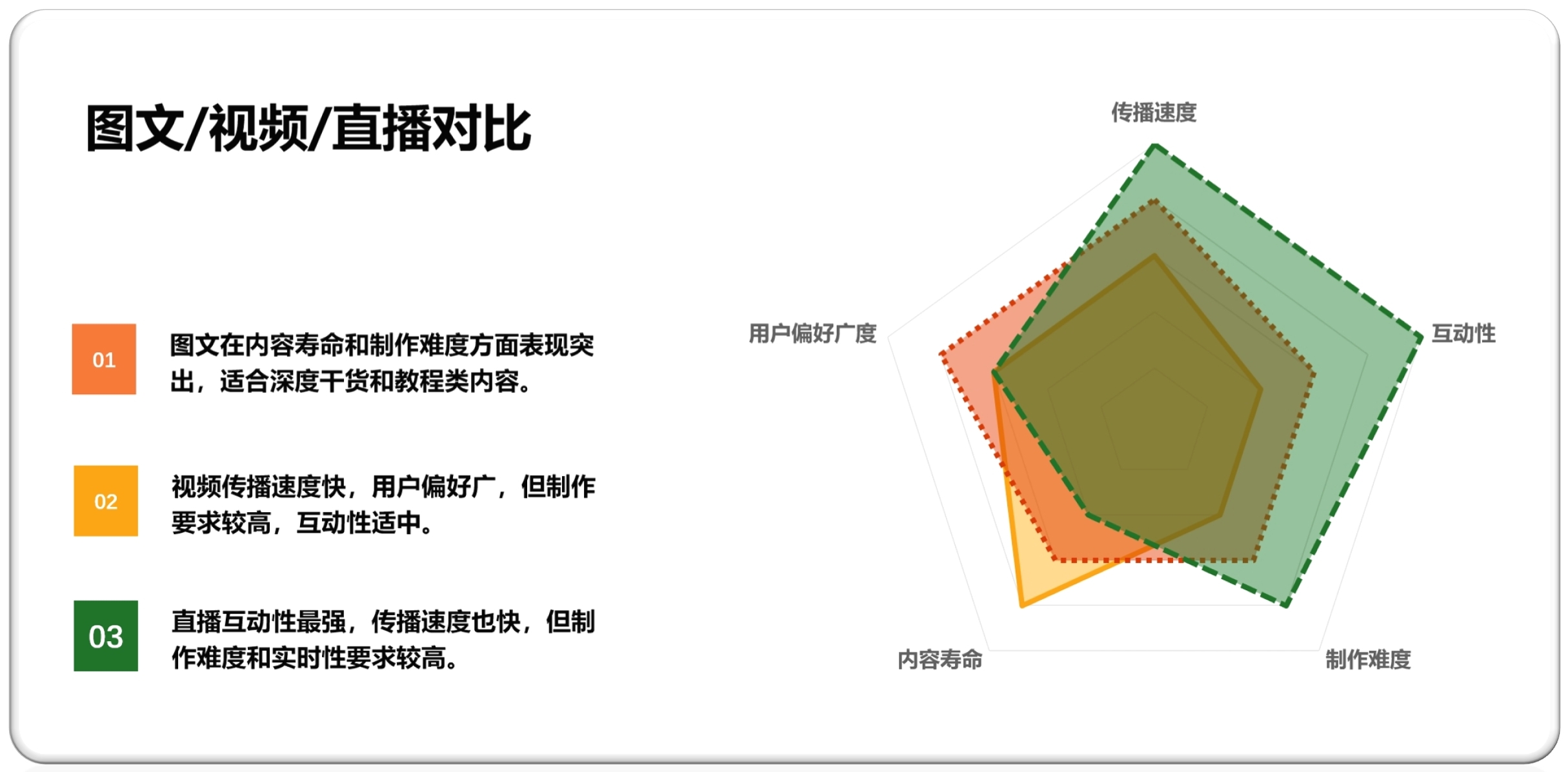 Основывайтесь на текстах и изображениях, подходящих для передачи подробной информации и сложных концепций. Легко для пользователей повторно читать и сохранять, срок жизни контента длиннее, подходит для системного контента.