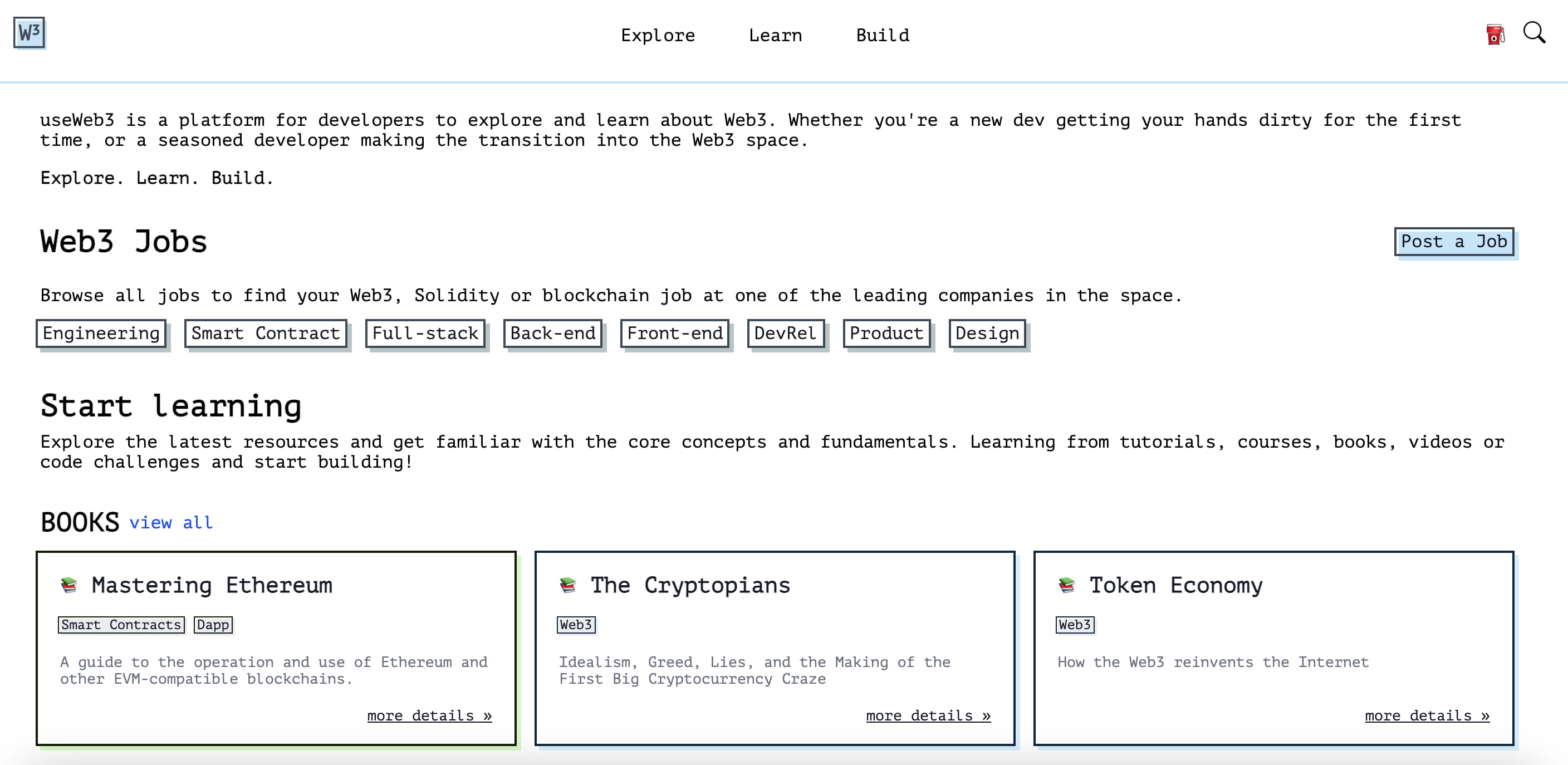 useWeb3 — это платформа, позволяющая разработчикам изучать и изучать Web3. Независимо от того, являетесь ли вы новым разработчиком, впервые начинающим, или опытным разработчиком, переходящим в мир Web3.
