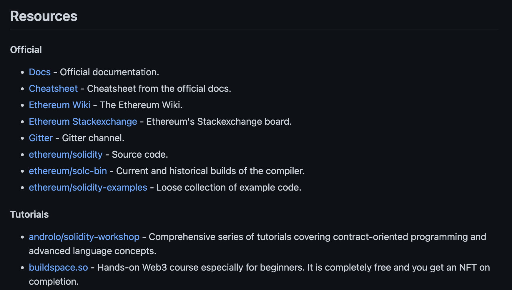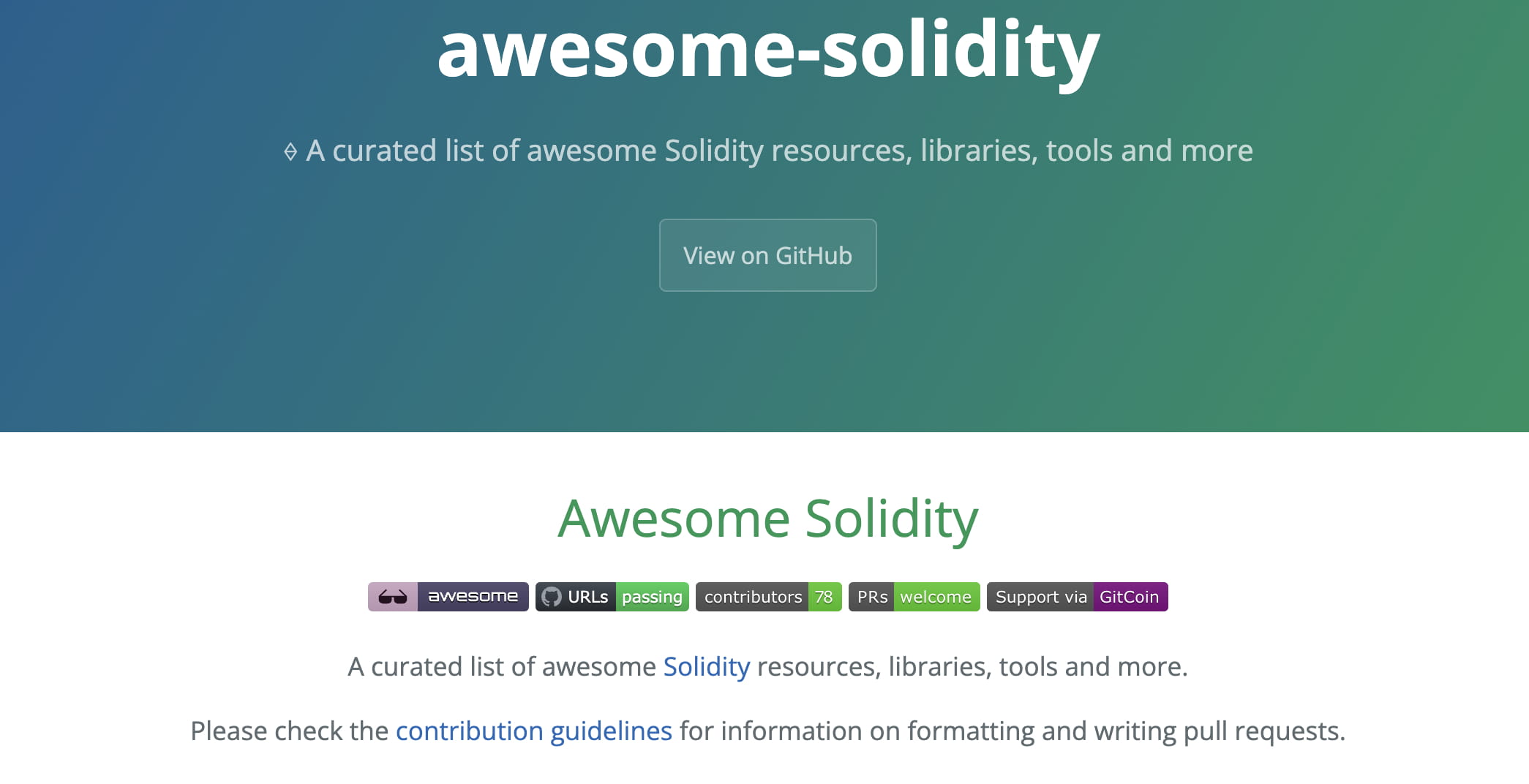 Отличный репозиторий Solidity с тщательно подобранным списком официальных ресурсов, справочных материалов, инструментов и многого другого.