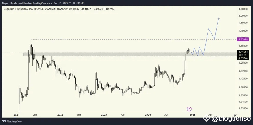 Trong phân tích của mình, Hardy đã nêu bật các mức hỗ trợ chính quanh $0,40 và $0,36, cho thấy các khu vực này rất quan trọng để duy trì cấu trúc tăng giá. Ông cũng vạch ra một quỹ đạo giá tiềm năng, dự đoán rằng Dogecoin sẽ củng cố ở mức hiện tại trong vài tuần trước khi tiếp tục đà tăng. Mục tiêu lạc quan của ông đối với DOGE là $2, mà ông tin rằng có thể đạt được nếu thị trường rộng lớn hơn vẫn thuận lợi và áp lực mua tăng cường.