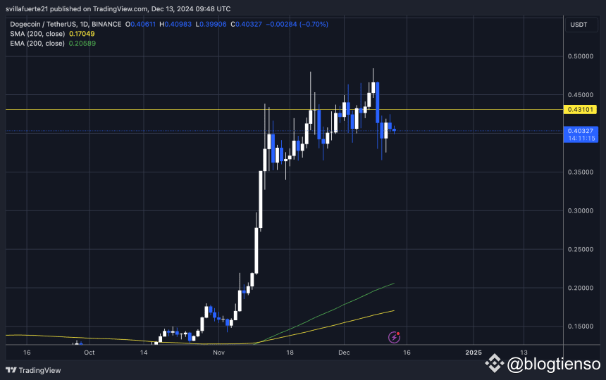 Dogecoin đang thử nghiệm nhu cầu trên mức 0,40 đô la sau nhiều ngày củng cố dưới mức cao nhất trong năm là 0,484 đô la. Giai đoạn biến động giá này đã khiến các nhà giao dịch lo lắng, vì giá Dogecoin dường như đang chuẩn bị cho một động thái quyết định. Mặc dù đà tăng tạm thời bị chững lại, tâm lý thị trường vẫn lạc quan, với nhiều nhà đầu tư dự đoán một đợt đột phá khác.