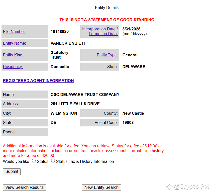 ✅ VanEck registers a BNB ETF in Delaware, making it their fifth crypto asset ETF filing in the state.