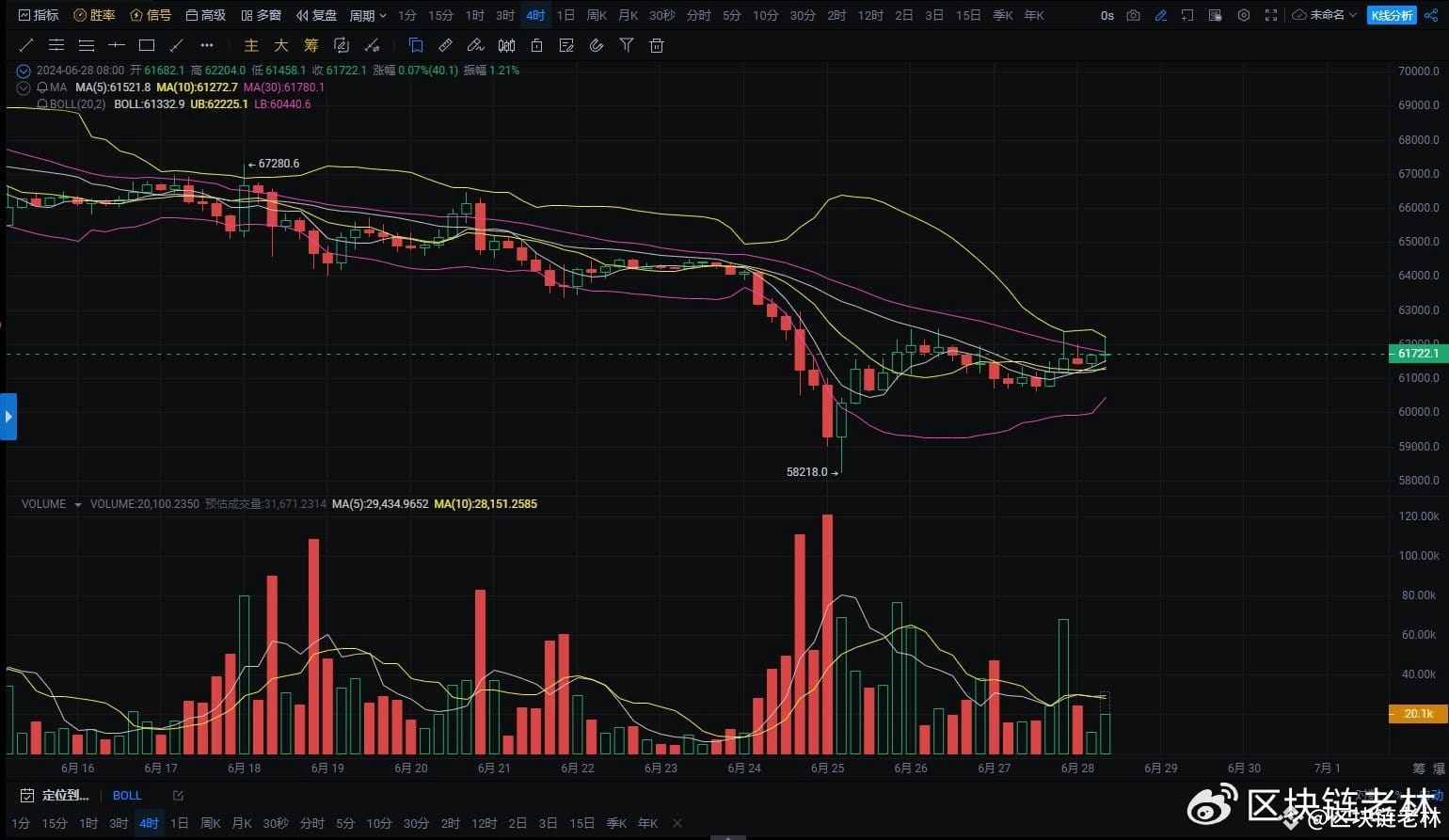 • K线形态:日线上,比特币价格形成多放炮形态,表明市场存在剧烈波动。