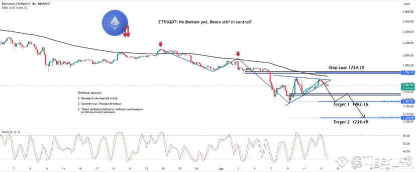 Hey Realistic Traders, is ETHUSDT just a dead cat bounce, or are we looking at an actual reversal? Let’s dive in...Since March 26, 2025, ETHUSDT has struggled to break above the EMA100 line, signaling a bearish trend. Additionally, a symmetrical triangle pattern has broken to the downside, further confirming bearish momentum.The Stochastic indicator has crossed and is moving downward within the neutral zone, confirming that selling pressure may continue.These signals indicate that Ethereum could drop toward our first target at $1,403. After hitting this level, a short pullback is likely as traders take profits, before the price potentially continues its descent toward a new low around $1,239.These targets were identified using a combination of Fibonacci ratios and classic support/resistance levels, as shown in the chart.This outlook remains valid as long as the price moves below the stop-loss level at 1,754.Support the channel by engaging with the content, using the rocket button, and sharing your opinions in the comments below.Disclaimer: "Please note that this analysis is solely for educational purposes and should not be considered a recommendation to take a long or short position on Ethereum.