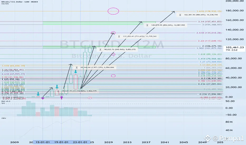 Based on the 12M BTCUSDT chart and Fibonacci extensions, these are the key upside targets and potential resistance zones: