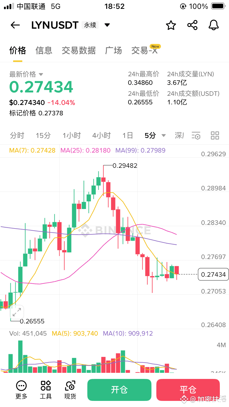 $LYN 当前价格在 0.28 美元 左右,整体走势在近期横盘震荡区间里蓄力,筹码在底部逐步沉淀。从 K 线图上来看,成交量开始有放大迹象,短期如果利好兑现,有机会走出一波趋势行情。
