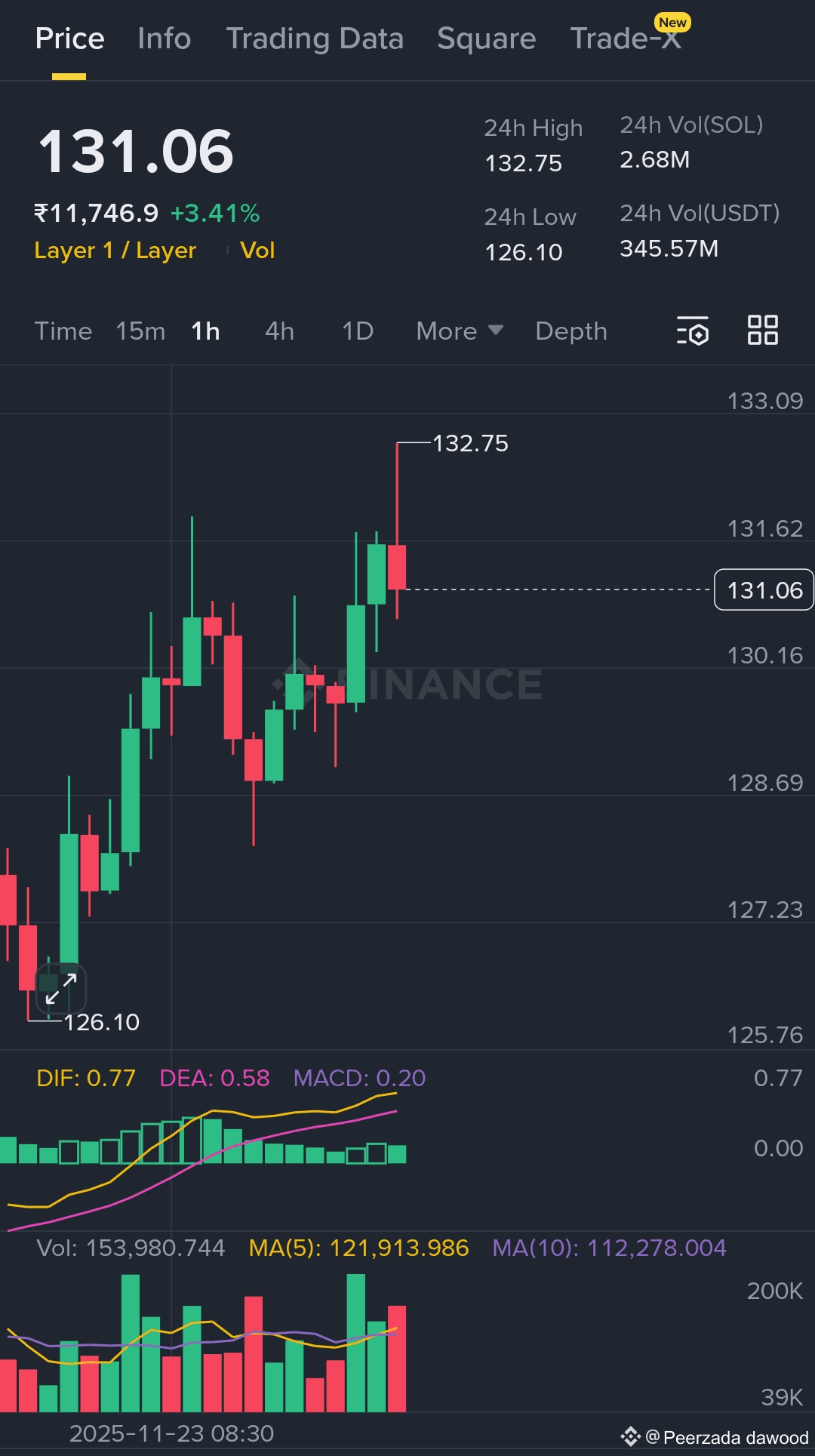 Recent High Rejection: The last couple of candles show the price attempting to push toward the 24h High of 132.75 but failing to hold that level, resulting in an upper wick and a move back down towards the current price of 131.06. This indicates selling pressure entering the market at the top.