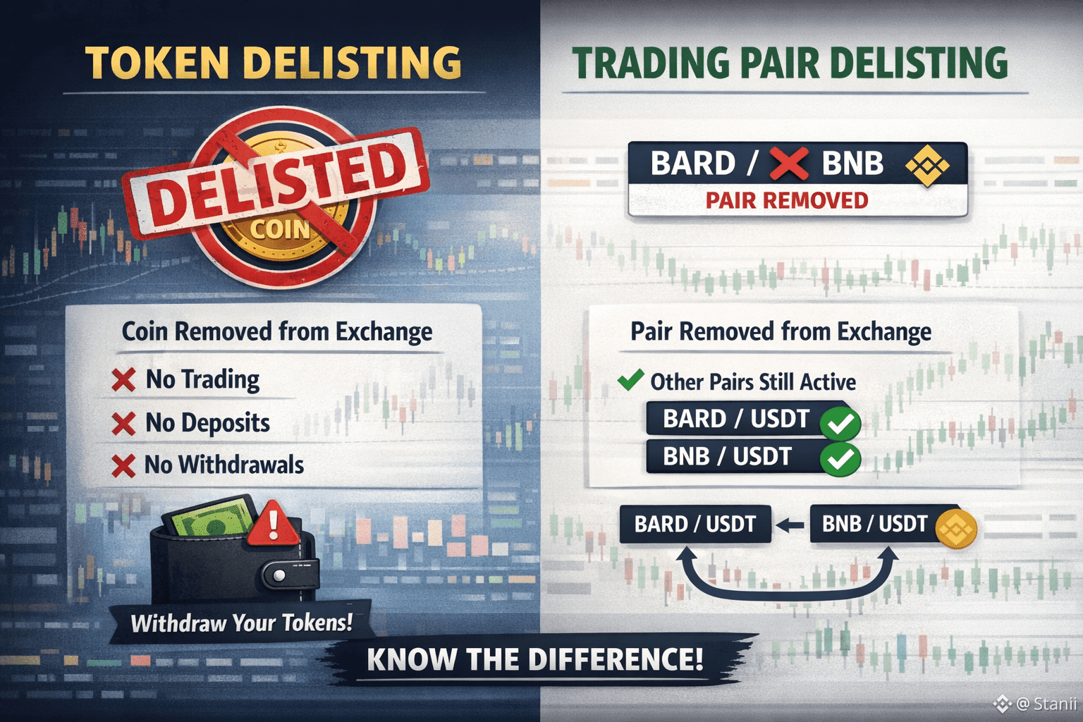 On the other hand, delisting a trading pair—like BARD/BNB—means the exchange stops allowing trades between those two specific tokens, but the tokens themselves remain listed on the platform. Users can still trade those tokens in other available pairs, such as BARD/USDT or BNB/USDT. This usually happens when a trading pair has low volume or liquidity, making it inefficient for the exchange to support.