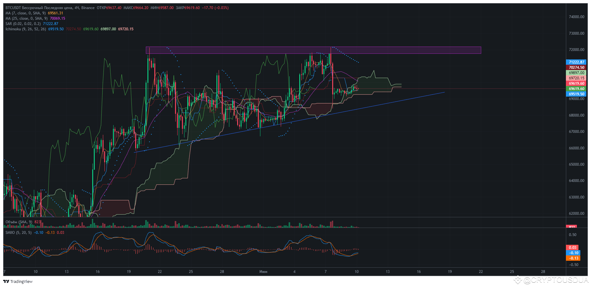 Приход и отток "умных денег": На основе текущих данных можно предположить, что значительная часть инвесторов пока остается в ожидании подтверждения тренда. В случае пробития уровня сопротивления 71222.87 можно ожидать дальнейшего роста.