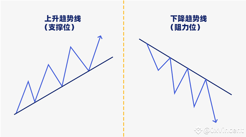 若不想进行复杂的计算,绘制趋势线也是一种分析行情的简便方法。上涨的趋势中会出现不断增高的局部低点 (Higher Low),画一道串连两个以上局部低点的直线就形成了上升趋势线,在跌破上升趋势线之前价格可能将继续上涨。反之,下跌的趋势中会出现不断降低的局部高点 (Lower High),将两个以上的局部高点连线可画出下降趋势线,在突破下降趋势线之前价格可能将继续下跌。