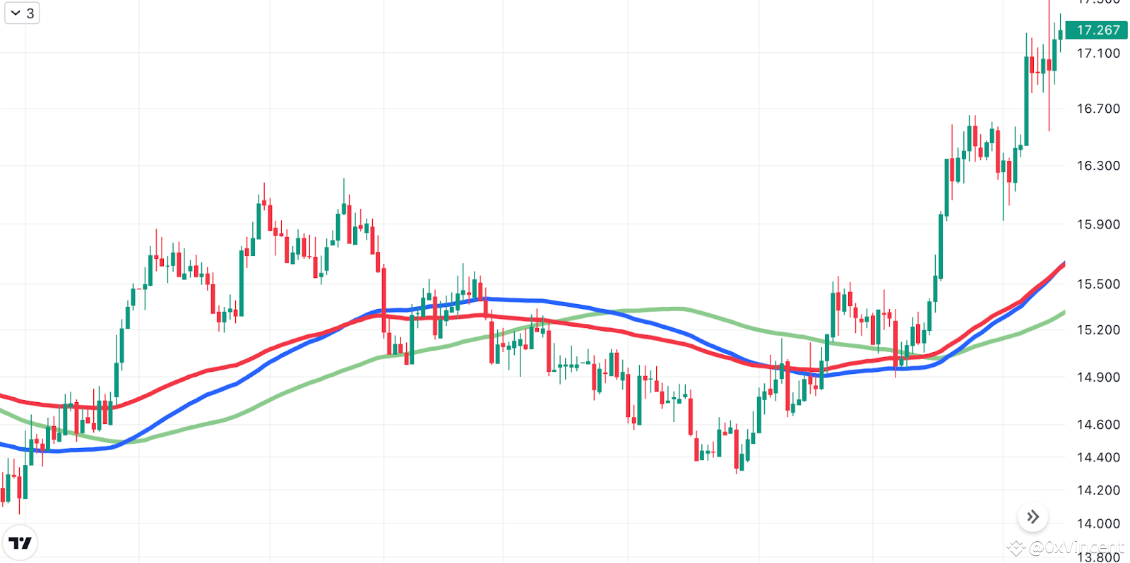 (参考图,绿线 = 100 SMA、红线 = 100 EMA、蓝线 = 100 WMA)