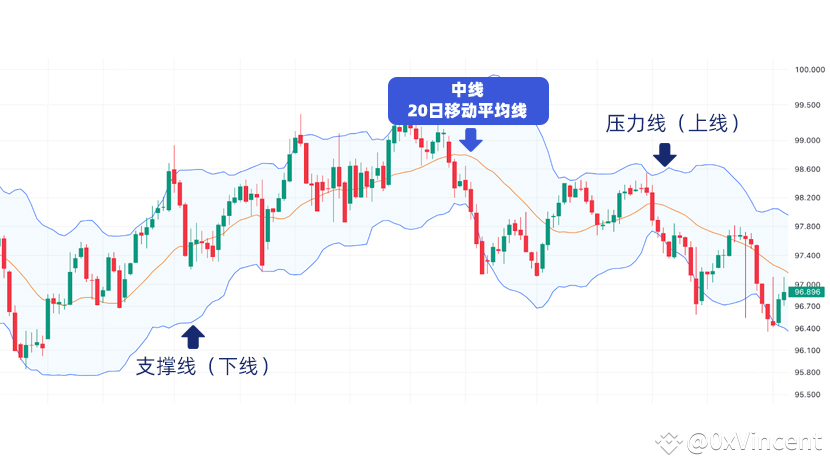 布林带 (Bollinger Bands,BB) 也是许多交易者喜欢使用的技术指标,它结合了移动平均和标准差的概念,将可能出现的价格范围绘制在 K 线图表上。具体作法是使用过往 n 个价格的简单移动平均数作为中心,计算此 n 个价格的标准差后向上和向下延伸 m 个标准差作为边界。布林带的特色在于当价格沿着均线来回震荡时,可用统计的方法计算不同价格出现的机率,在常态分布下约有 95% 的数值会落在离中心值 2 倍标准差的范围内。价格靠近布林带上缘或下缘时通常都表示与均值间的乖离较大,可能是潜在的买入或卖出时机。