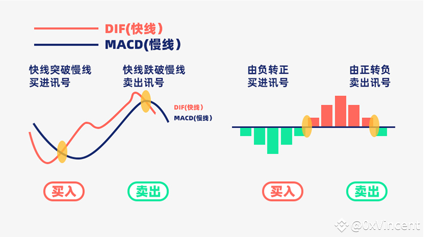 有些指标则是采用其他指标计算得出,像是异同移动平均线 (Moving Average Convergence / Divergence,MACD) 指标是计算两个不同时间周期的指数移动平均价格差,以构成 MACD 线 (快线)。计算 MACD 线的指数移动平均可以看出 MACD 线的变化趋势,又被称作讯号线 (慢线)。将 MACD 线与讯号线之数值相减,则可得出 MACD 直方图。当 MACD 线由下往上穿越讯号线时,意味着近期指数平均价格差为正且大于均值,是一个多头走势的征兆; MACD 线由上往下穿越讯号线,则表示近期指数平均价格差为负且小于均值,是空头行情中常见的样态。