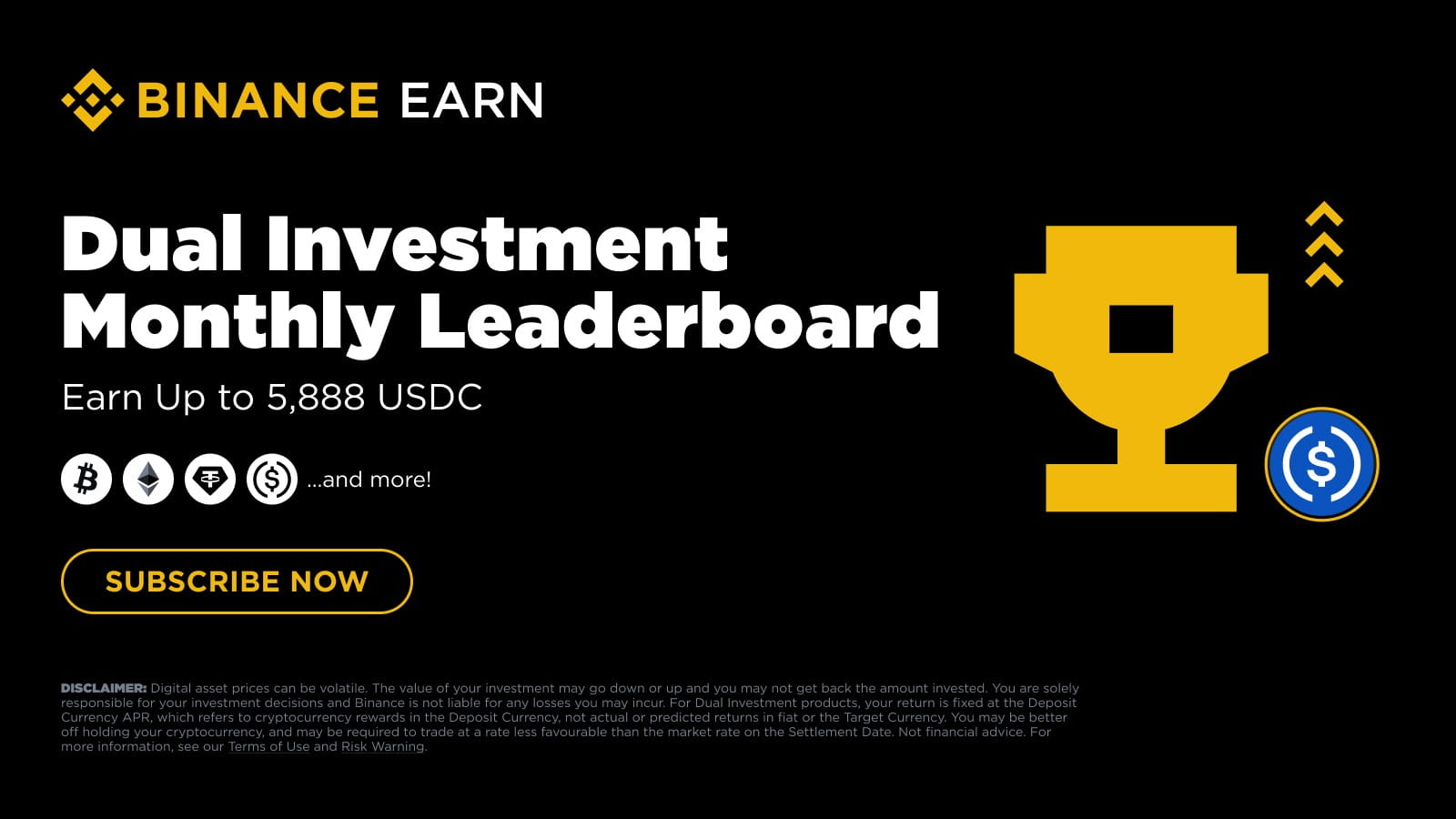 Binance Earn ra mắt chương trình Bảng xếp hạng tháng 1 dành cho tất cả người dùng dual investment, với tổng giá trị thưởng lên đến 5.888 USDC.